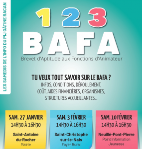 /Dans le cadre des Samedis de l’Info organisés par le Point Info Jeunesse Gâtine-Racan, retrouvez 3 dates pour tout savoir sur le BAFA (Brevet d’Aptitude aux Fonctions d’Animateur)