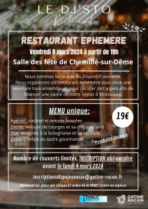 /Les jeunes et les animateurs du Dispositif Jeunesse, en partenariat avec l’équipe du Projet Alimentaire Territorial de la Communauté de Communes Gâtine-Racan sont heureux d’ouvrir les portes du DJ’STO, leur restaurant éphémère. Cette soirée exceptionnelle placée sous le signe de la convivialité et de la […]
