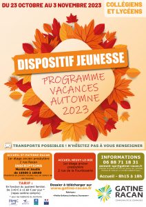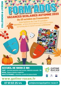 /Pour les prochaines vacances d’automne, Guillaume, Clément et Lucile vous proposent 2 semaines animées. La première sera consacrée au théâtre et la 2nde au street art. Ouverture des inscriptions à partir du 3 octobre. 07 81 93 25 44 ou polejeunesnpp@gatine-racan.fr