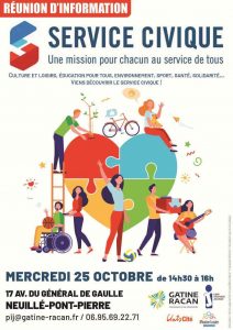 /Vous souhaitez tout connaitre sur le Service Civique ? Les domaines de la culture, des loisirs, de l’éducation pour tous, l’environnement, le sport, la santé, la solidarité… vous intéressent ? Réunion d’information mercredi 25 octobre De 14h30 à 16h PIJ – Neuillé-Pont-Pierre Info pij@gatine-racan.fr 06 […]