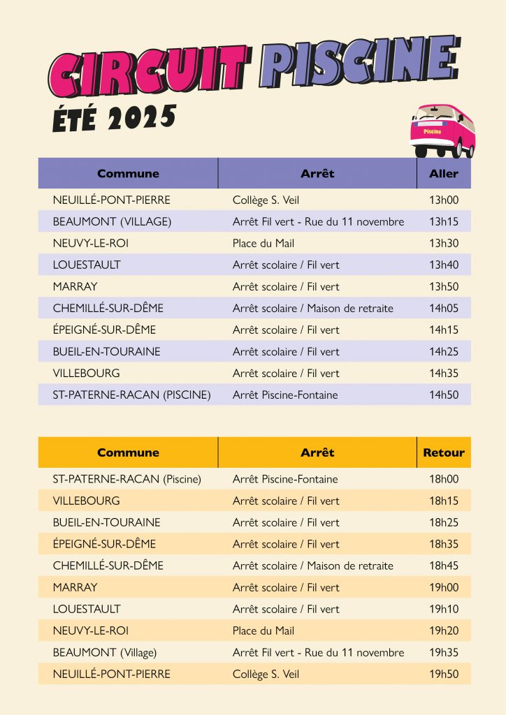 Du 8 juillet au 29 août 2025, la Communauté de Communes Gâtine-Racan propose des navettes gratuites entre les communes du territoire et la piscine communautaire de Saint-Paterne-Racan. C’est un service GRATUIT et ACCESSIBLE À TOUS, pour petits et grands !